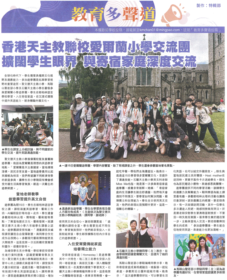 新聞媒體採訪 Wong Sir2025-10-15T15:21:30+08:002月26日 782 二零二五年十月: 明報(教得樂) – 香港天主教聯校愛爾蘭小學交流團擴闊學生眼界 與寄宿家庭深度交流 二零二五年六月: 明報 – 助孩子建立自信迎接未來挑戰 二零二五年五月: 香港學校網 – 孩子建立自信迎接未來挑戰 二零二五年二月: 香港無線電視台 – 桌球訪問 二零二四年十月: 親子王周刊校長訪問 – 準備就緒迎接呈分式 二零二四年七月: 沙田區升小博覽 – 校長訪問