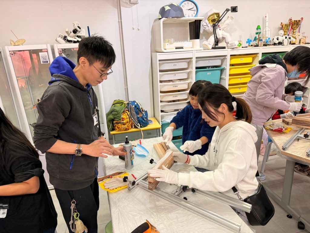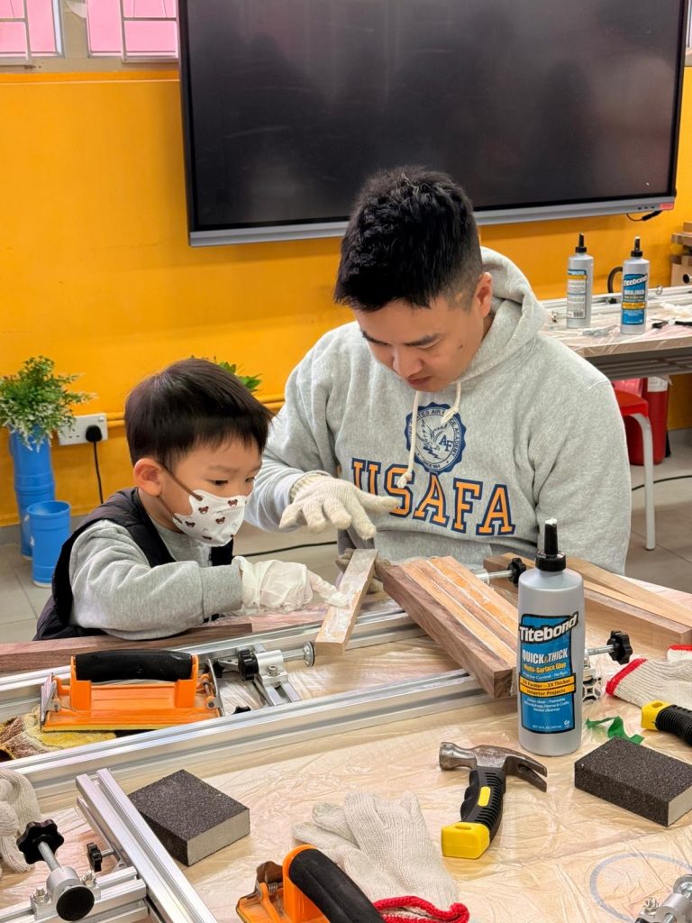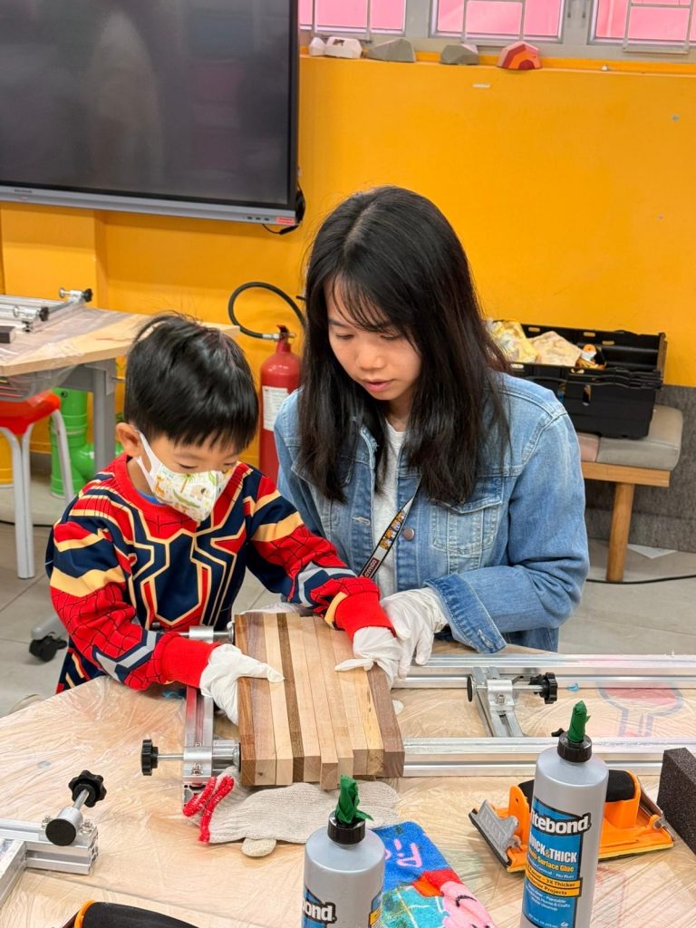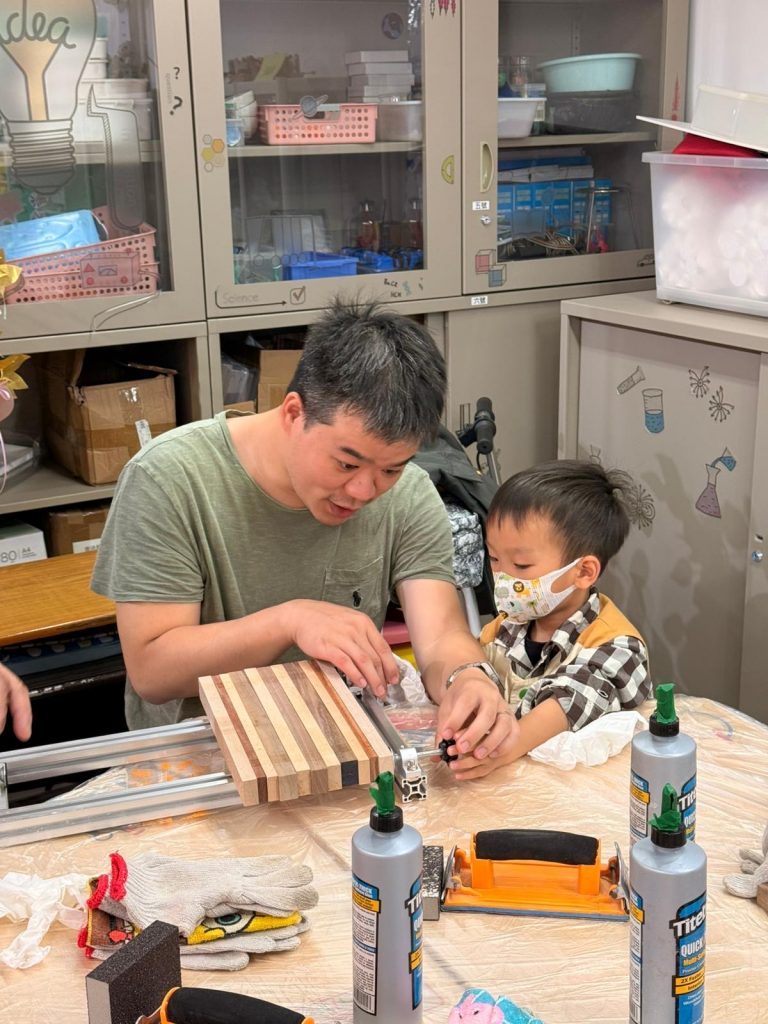活動中,孩子們戴上口罩與手套🧤,神情專注地與父母合作製作拼接砧木板。在導師的指導下,大小朋友合力塗抹專用膠水、排列木條,並學習使用專業夾具來固定作品。家長們在一旁耐心協助,從打磨到組裝,每一個步驟都充滿了互動與默契💪🏻。這不僅鍛鍊了小朋友的手眼協調能力🤚👀和專注力,更讓他們深刻體會到「由零開始」製作物品的成就感😊。