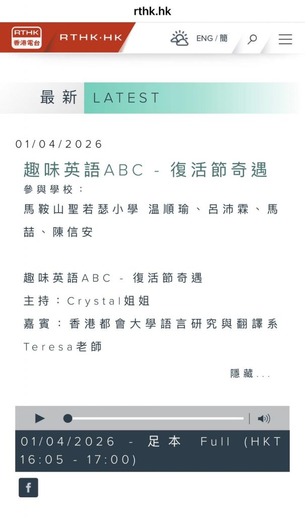 參與香港電台普通話台「普出校園精彩」 Wong Sir2026-04-01T19:20:47+08:004月1日 27 四位同學(温順瑜、呂沛霖、馬喆、陳信安)於01/04/2026到香港電台參與普通話台「普出校園精彩」的節目錄製,直播的主題是「趣味英語ABC – 復活節奇遇」。 他們不但分享了復活節假期的規劃,還學習到復活節習俗的英語小知識呢!歡迎到以下連結重溫節目: #香港電台 #普通話節目 #節目錄製 https://www.rthk.hk/radio/pth/programme/schooltour/episode/1089551