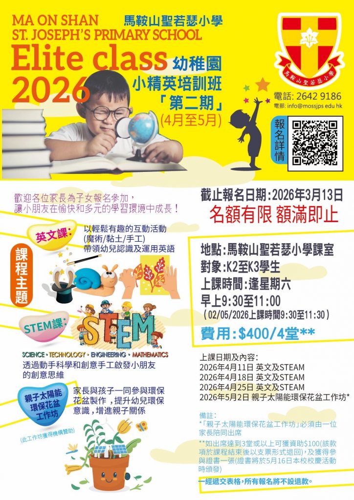 馬鞍山聖若瑟小學將於2026年4月至5月期間,舉辦「幼稚園小精英培訓班第二期」,對象為K2至K3學生。本課程結合有趣的英文互動遊戲活動(魔術/黏土/手工)  及科學小手工體驗,旨在提升幼兒對英文學習的興趣,並啟發他們對STEAM科學領域的好奇心。